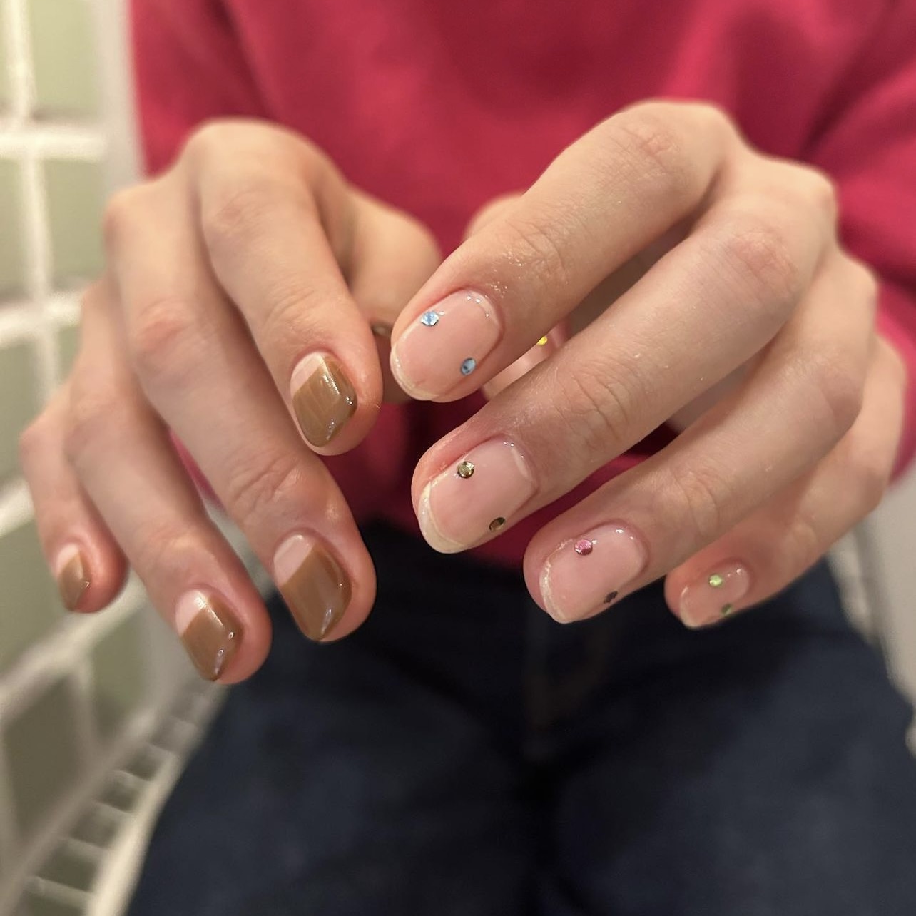 シンプルミラーフレンチビジュー【担当】宮城 COLOR ブラウン ARTTYPE フレンチ TASTE シンプル 個性派 PRICE ¥7001~¥9000 【HAND】持ち込み60分アート少なめ相談コース¥5225〜※アート代別途 ¥7425