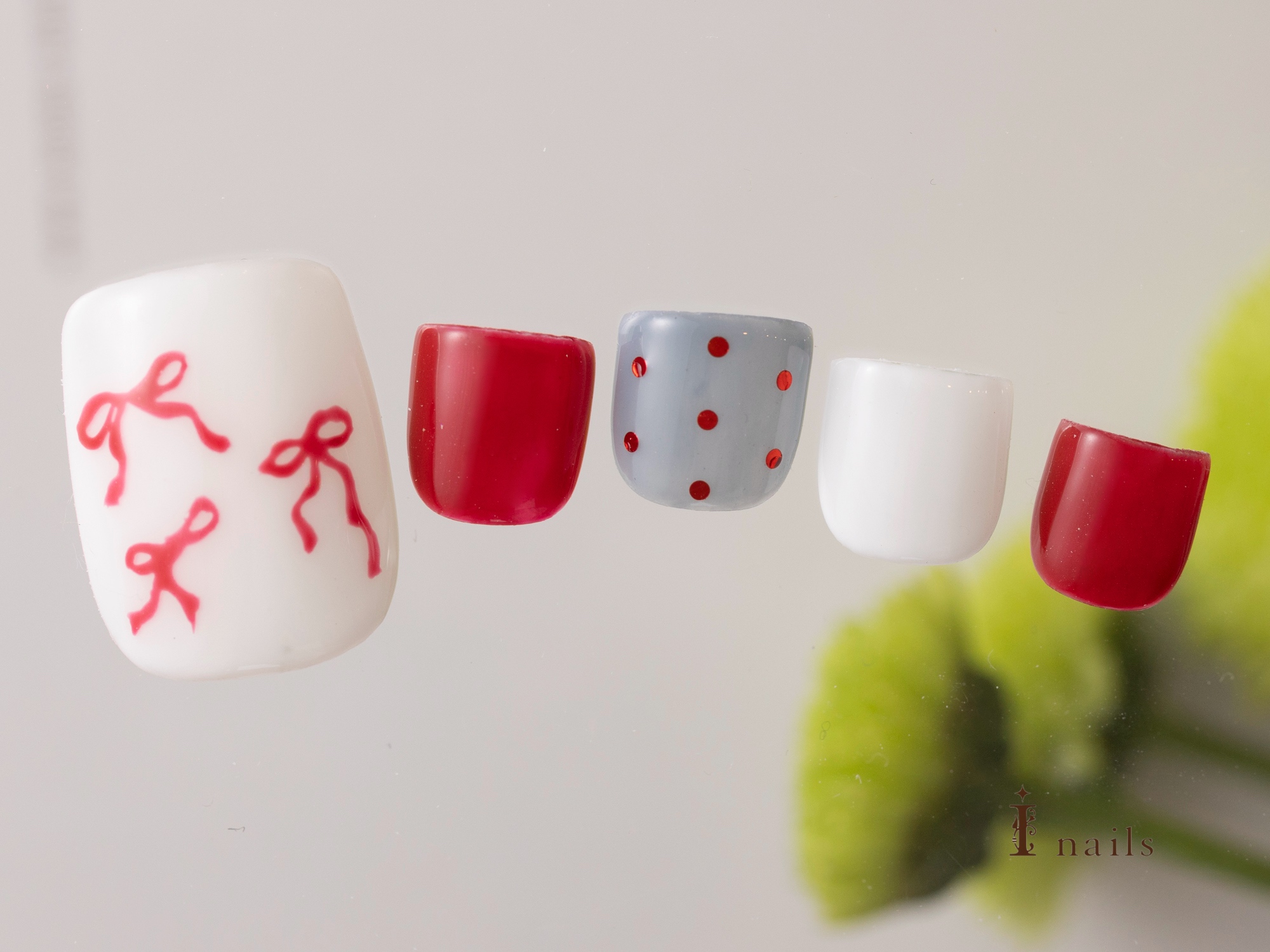 リボンフット【担当】泉 COLOR ホワイト レッド グレー ARTTYPE ワンカラー ホログラム TASTE ラブリー ガーリー 大人可愛い おしゃれ SCENE オールシーズン デイリー PRICE ¥7001~¥9000 手描きのフットネイル ¥8480