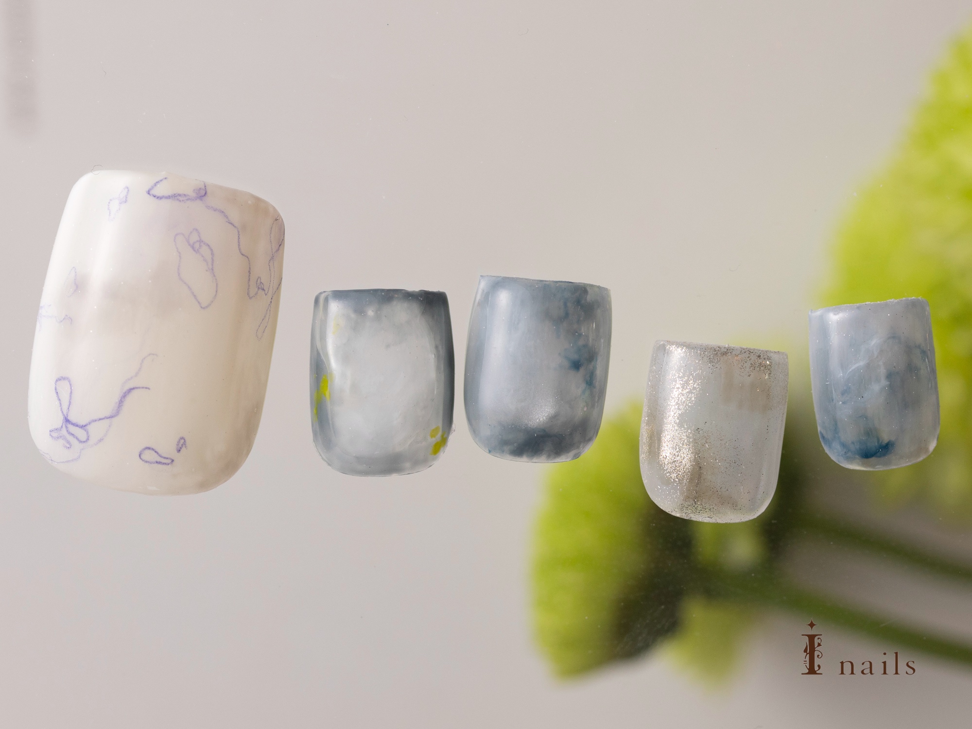 ニュアンスアートフット【担当】城間 COLOR ブルー シルバー ベージュ くすみ系 ARTTYPE ワンカラー ニュアンス ミラー TASTE 大人可愛い 上品 おしゃれ SCENE 夏ネイル オールシーズン デイリー PRICE ¥9001~¥11000 ニュアンスフットネイル ¥9480