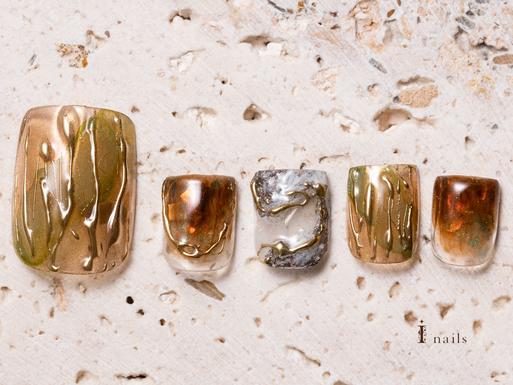 ニュアンスフット【担当】根本 COLOR グリーン ゴールド ベージュ メタリック くすみ系 ARTTYPE ニュアンス ミラー ぷくぷく TASTE クール ゴージャス レトロ 個性派 大人可愛い SCENE 秋ネイル 冬ネイル 夏ネイル PRICE ¥9001~¥11000 いろんなアートが詰まったニュアンスフット¥9480