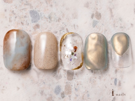 ミラークリアネイル【担当】泉 COLOR ゴールド ベージュ メタリック くすみ系 ARTTYPE ワンカラー ニュアンス ミラー 凸凹 マット TASTE シンプル 個性派 おしゃれ SCENE 春ネイル 秋ネイル オールシーズン デイリー PRICE ¥7001~¥9000 ミラーとマットのクリアネイル¥8000
