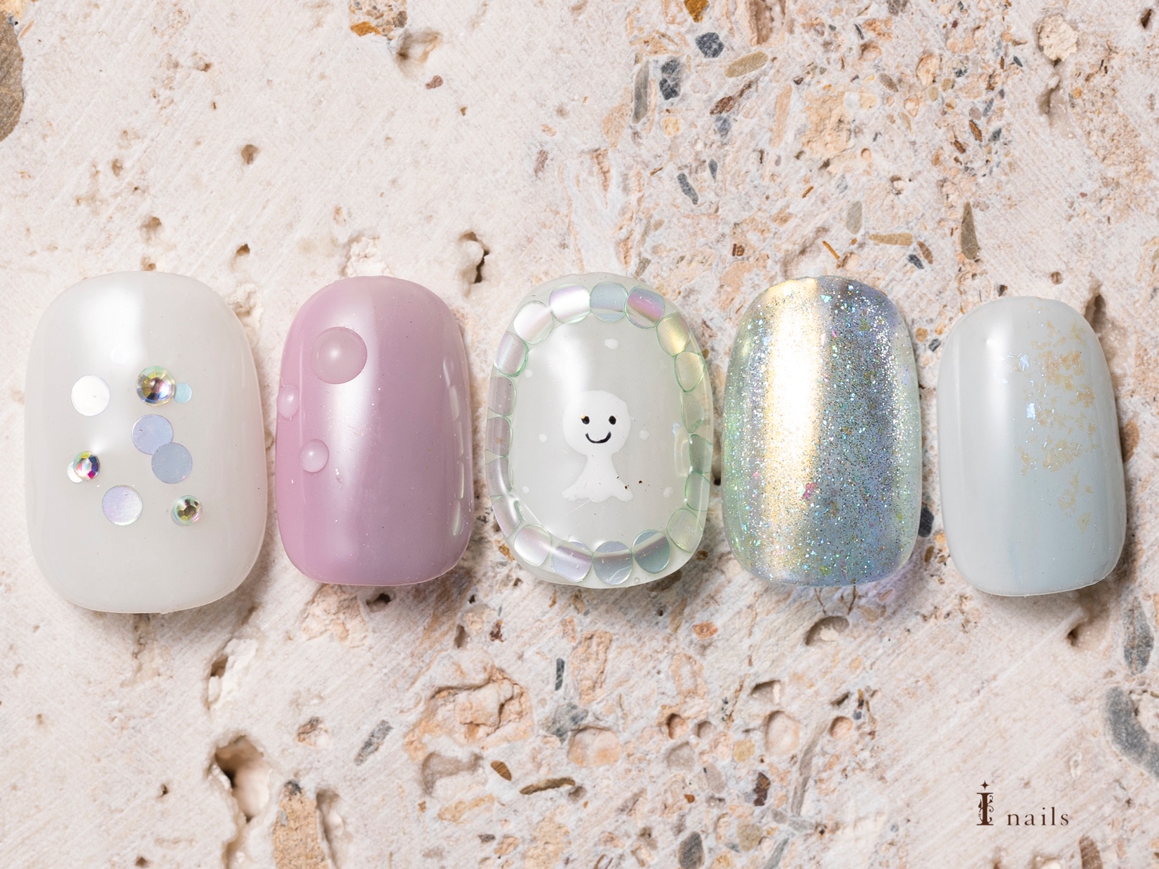 てるてるネイル【担当】泉 COLOR ホワイト ブルー パープル オーロラ ARTTYPE ワンカラー ニュアンス ミラー フィルム マグネット 箔 TASTE デコレーション ガーリー 大人可愛い SCENE 春ネイル 夏ネイル PRICE ¥9001~¥11000 手描きのてるてる坊主ネイル¥9480