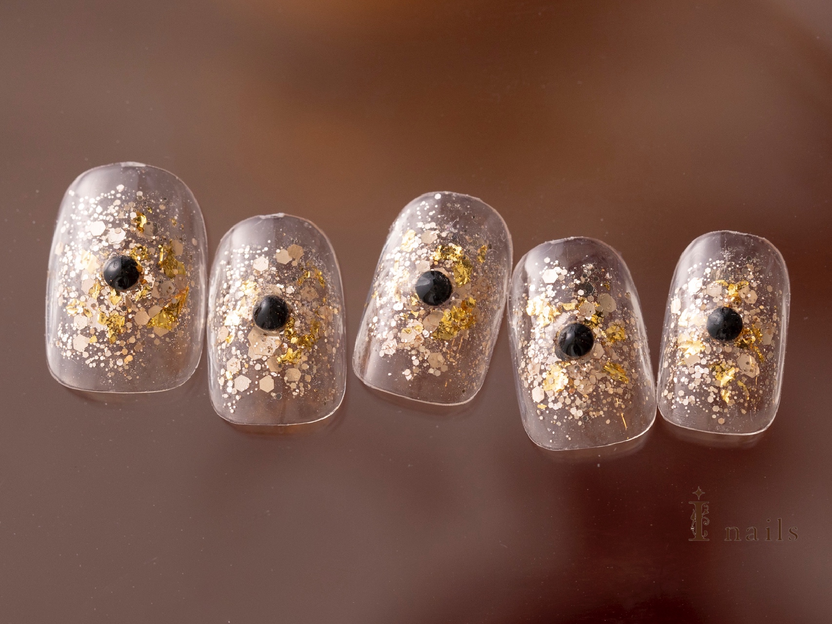 ラメチーク【担当】吉宮 COLOR ブラック ゴールド ARTTYPE ラインストーン ラメ TASTE シンプル モード おしゃれ SCENE 秋ネイル PRICE ¥7001~¥9000 ラメチークとストーン¥8000