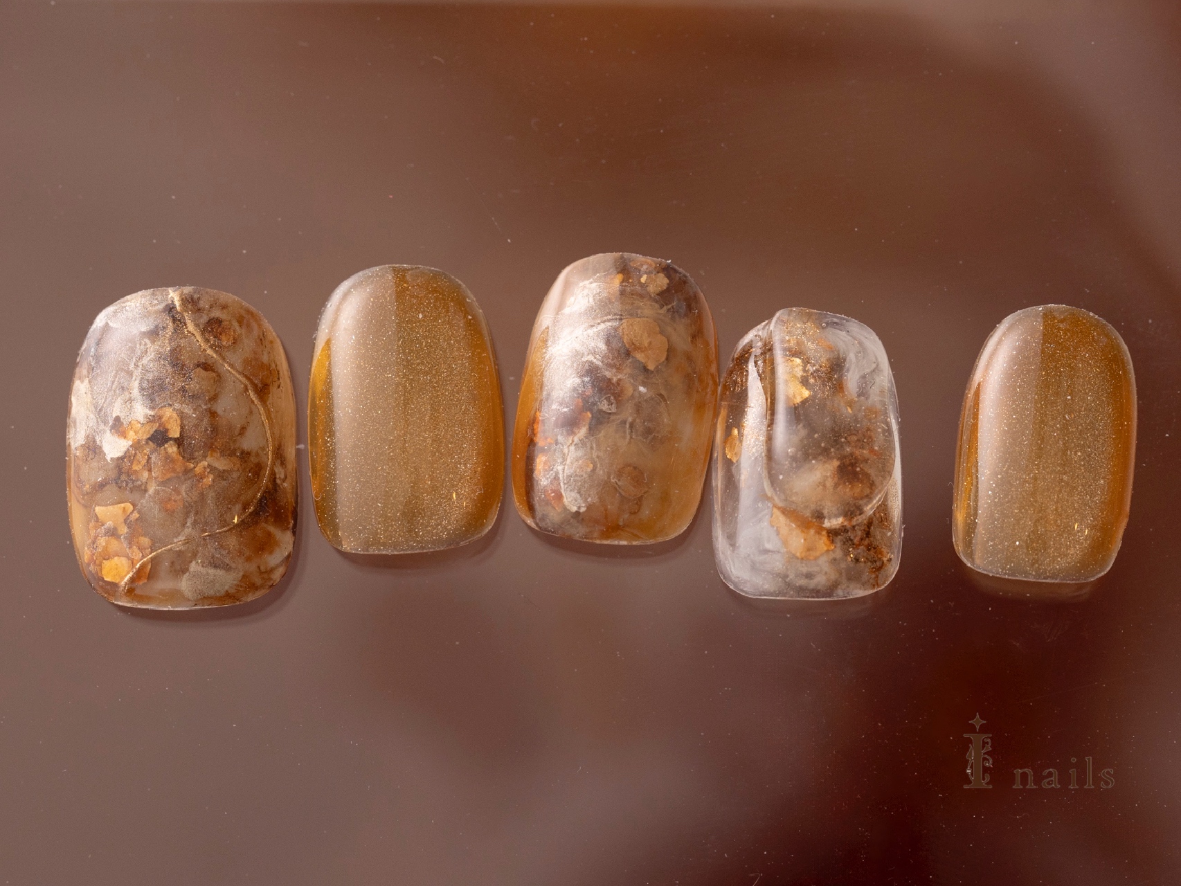 奥行きニュアンス【担当】櫻田 COLOR ブラウン ゴールド メタリック ARTTYPE タイダイ ニュアンス 凸凹 TASTE モード 上品 おしゃれ SCENE 秋ネイル PRICE ¥9001~¥11000 秋カラーニュアンス¥9480