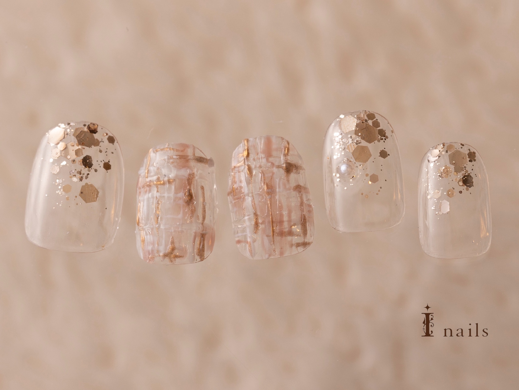クリアツイードネイル【担当】城間 COLOR ピンク シルバー ゴールド ARTTYPE ラメ パール ホログラム ミラー TASTE ラブリー ガーリー 大人可愛い おしゃれ SCENE 秋ネイル 冬ネイル PRICE ¥7001~¥9000 クリアベースとキラキラネイル¥8000