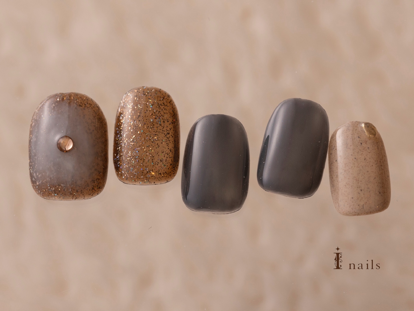 ブラウンとチーク【担当】吉宮 COLOR ブルー ブラウン ゴールド ベージュ くすみ系 ARTTYPE ワンカラー ラインストーン ニュアンス TASTE クール モード 上品 おしゃれ SCENE 秋ネイル 冬ネイル PRICE ¥7001~¥9000 ブラウンカラーにチークネイル¥8480