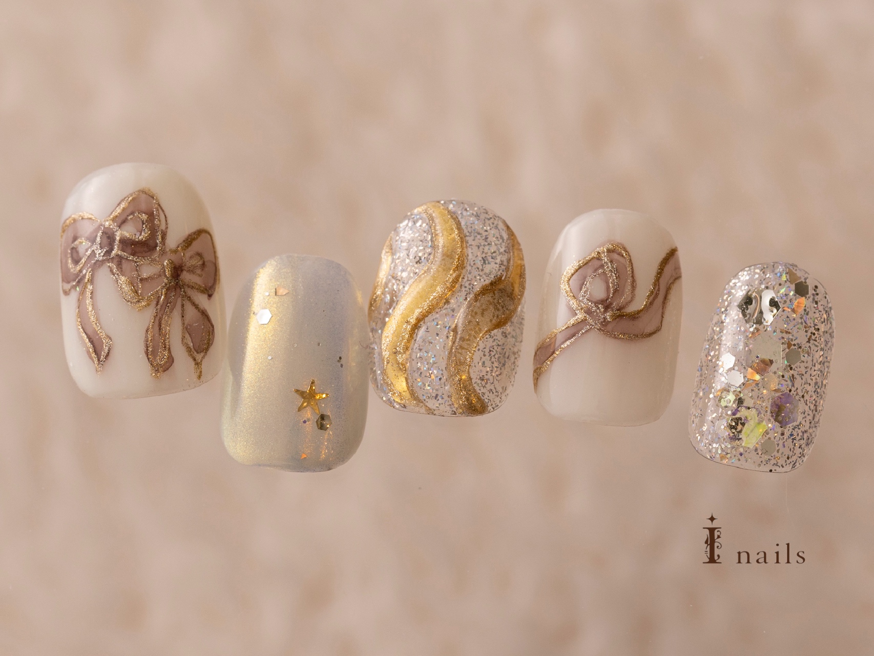クリスマスリボンネイル【担当】泉 COLOR ホワイト ブラウン ゴールド オーロラ ARTTYPE ワンカラー ラメ ホログラム ミラー マグネット TASTE デコレーション ラブリー ガーリー おしゃれ SCENE クリスマス 冬ネイル PRICE ¥9001~¥11000 手描きリボンネイル¥9980