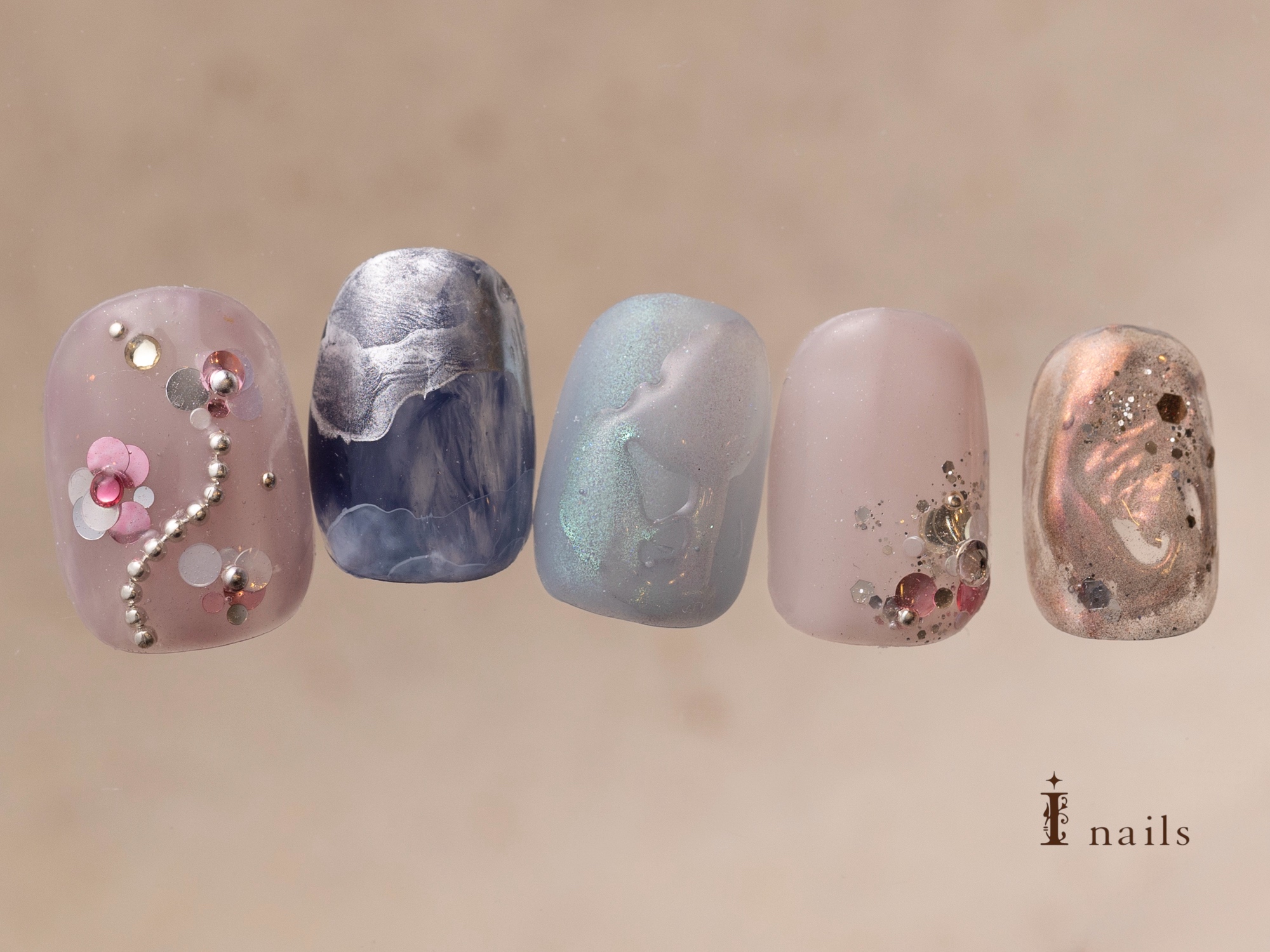 ニュアンス桜ネイル【担当】酒主 COLOR ブルー ピンク オーロラ くすみ系 ARTTYPE ワンカラー ラインストーン ラメ ホログラム ニュアンス インクアート 水彩 凸凹 TASTE デコレーション 個性派 SCENE 春ネイル PRICE ¥9001~¥11000 個性的な桜デザイン ¥9480