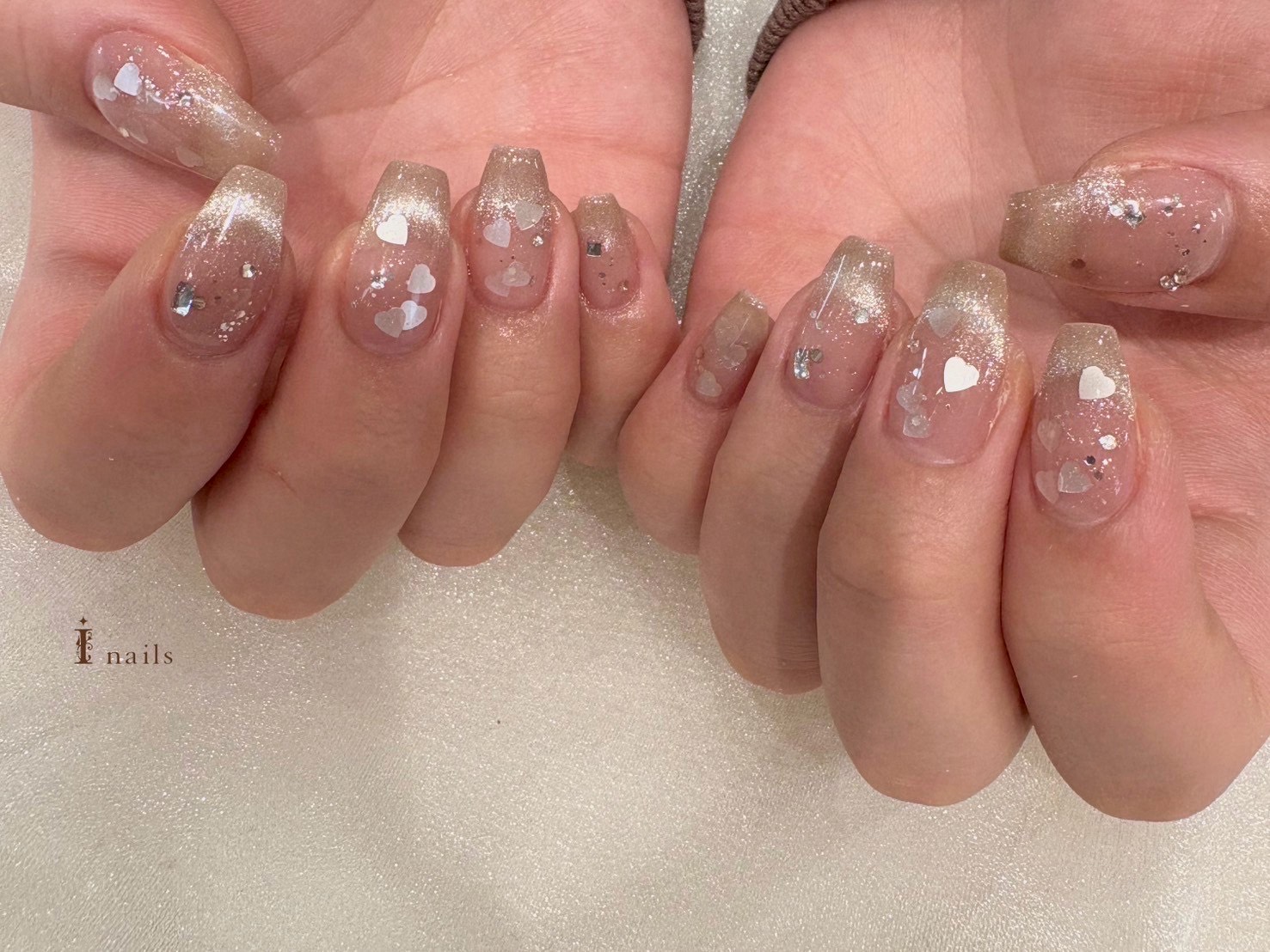 春ハートマグネットフレンチ【担当】中山 COLOR ピンク ゴールド ベージュ ARTTYPE ストーン ホログラム マグネット TASTE ラブリー ガーリー 大人可愛い SCENE デート 春ネイル デイリー PRICE ¥9001~¥11000 春ハートマグネットフレンチ \¥9500