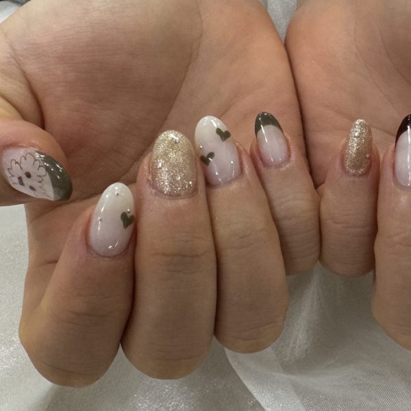 フレンチやラメやワンちゃんデザインなど色々組み合わせオシャレデザインです。