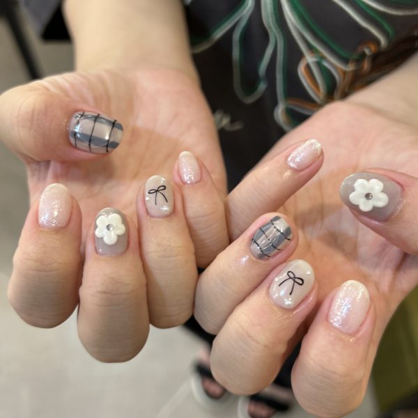 ぷっくりなお花とチェックが可愛い個性派ネイル♪