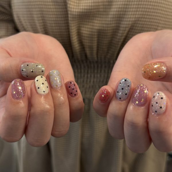 これからの季節にぴったりなパステルカラーに星ホロで流行りのドットをしました♪