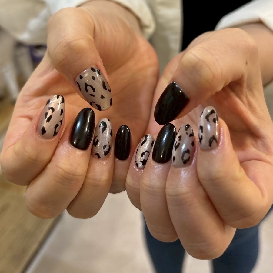 レオパードネイル【担当】本山 COLOR ブラック ブラウン ベージュ ARTTYPE ワンカラー アニマル マグネット TASTE シンプル ゴージャス 個性派 おしゃれ SCENE 秋ネイル オールシーズン デイリー PRICE ¥9001~¥11000 レオパードのベースにマグネット仕込むのおすすめです♪~8980円
