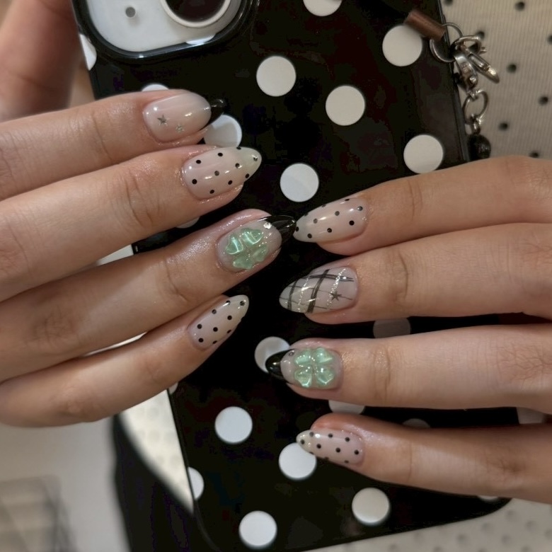 ウイッシュコアネイル【担当】北 COLOR ブラック シルバー ベージュ グレージュ ARTTYPE ワンカラー フレンチ ストーン ドット チェック ホログラム パーツ TASTE シンプル ポップ デコレーション ガーリー SCENE 誕生日 バレンタイン 冬ネイル オールシーズン デイリー PRICE ¥9001~¥11000 流行りのクローバーに星、ドットすべて詰込んだネイル☆~11000円