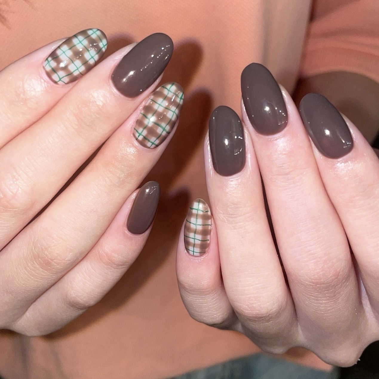 ブラウンチェックネイル【担当】酒井 COLOR ブラウン グリーン グレージュ ARTTYPE ワンカラー チェック TASTE シンプル 個性派 上品 おしゃれ SCENE 秋ネイル オールシーズン デイリー PRICE ¥7001~¥9000 今の時期にぴったりチェックネイル色変えてもかわいいです♪~8990円