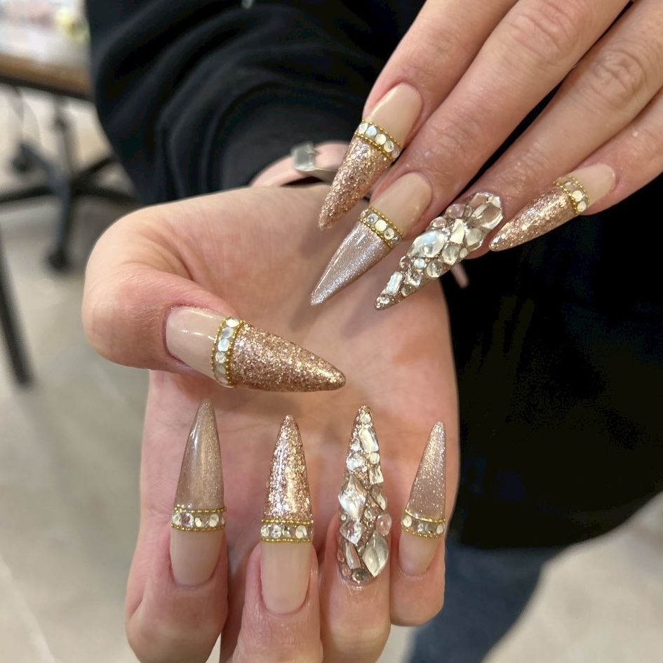 ロングビジューネイル【担当】本山 COLOR ピンク ブラウン シルバー ベージュ ARTTYPE ワンカラー ストーン パーツ TASTE エレガント ゴージャス ブライダル デコレーション 大人可愛い 上品 SCENE 誕生日 パーティー 結婚式 デート オールシーズン デイリー PRICE ¥9001~¥11000 ロングにクリスタルパーツとても映えます!!11000円~