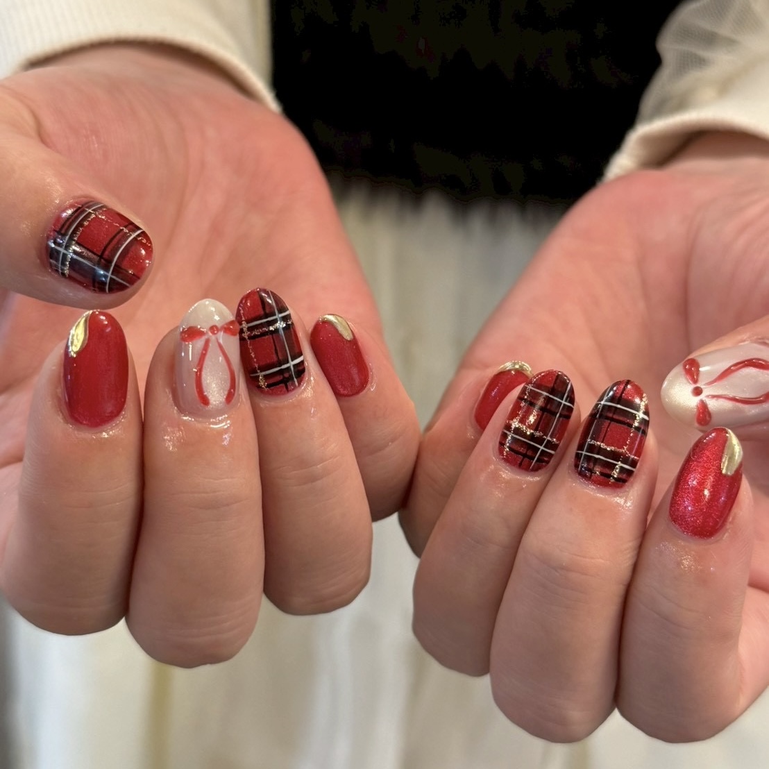 チェックリボンネイル【担当】出井 COLOR ブラック レッド シルバー ベージュ ARTTYPE ワンカラー チェック ミラー ぷくぷく TASTE シンプル ラブリー ガーリー 大人可愛い SCENE 誕生日 パーティー デート バレンタイン クリスマス 冬ネイル オールシーズン デイリー PRICE ¥9001~¥11000 チェックとぷっくりリボン♪9980円