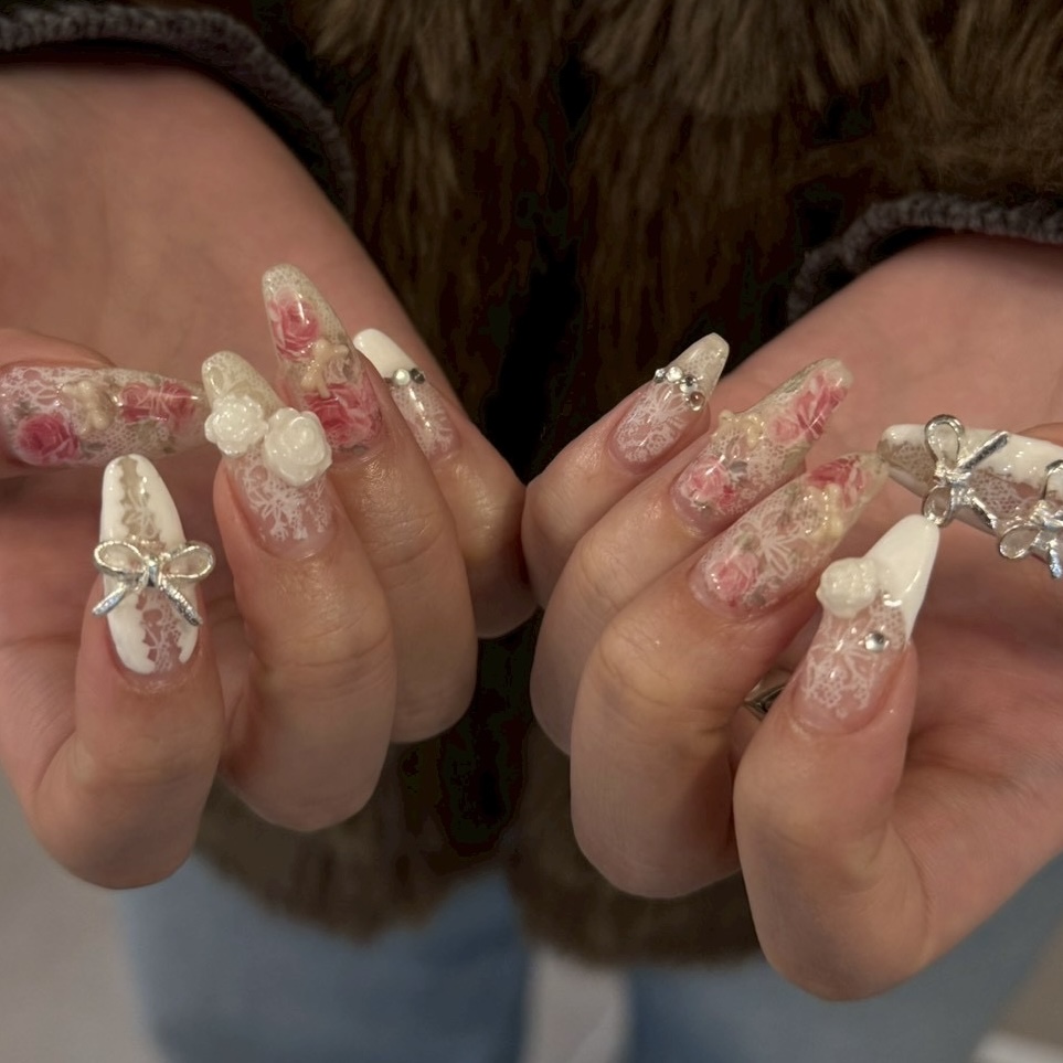 お花ホイルネイル【担当】出井 COLOR ホワイト ピンク クリアー シアー ARTTYPE ワンカラー ストーン ホイル パーツ TASTE シンプル スウィート デコレーション 大人可愛い 上品 おしゃれ SCENE 春ネイル オールシーズン デイリー PRICE ¥9001~¥11000 お花のホイルとパーツでガーリーに♡11000円