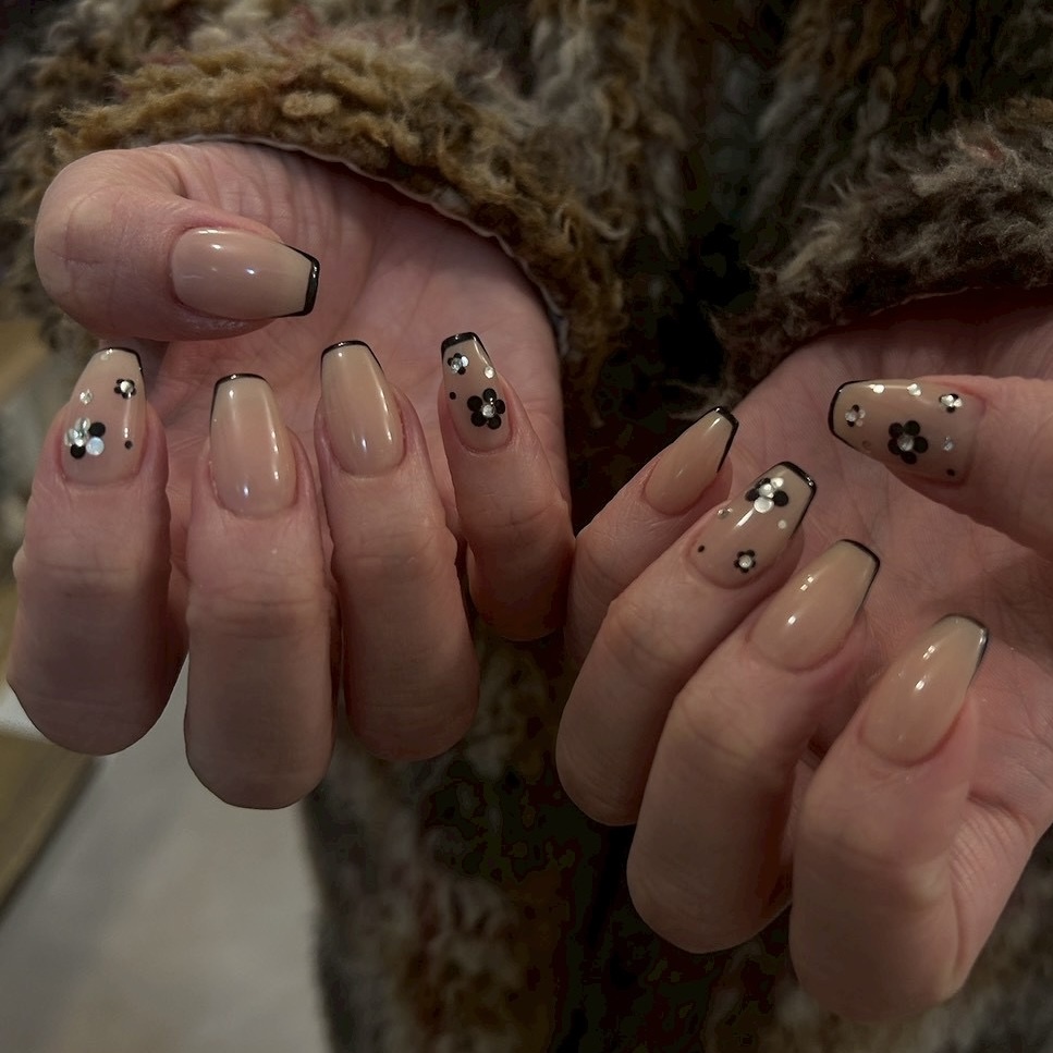 ホロフラワーネイル【担当】本山 COLOR ブラック ベージュ ARTTYPE ワンカラー フレンチ ストーン ホログラム TASTE シンプル クール スウィート 大人可愛い 上品 おしゃれ SCENE 誕生日 パーティー 結婚式 デート 卒業式 春ネイル オールシーズン デイリー PRICE ¥7001~¥9000 スキニーフレンチとホログラムで大人な雰囲気に♡~8980円