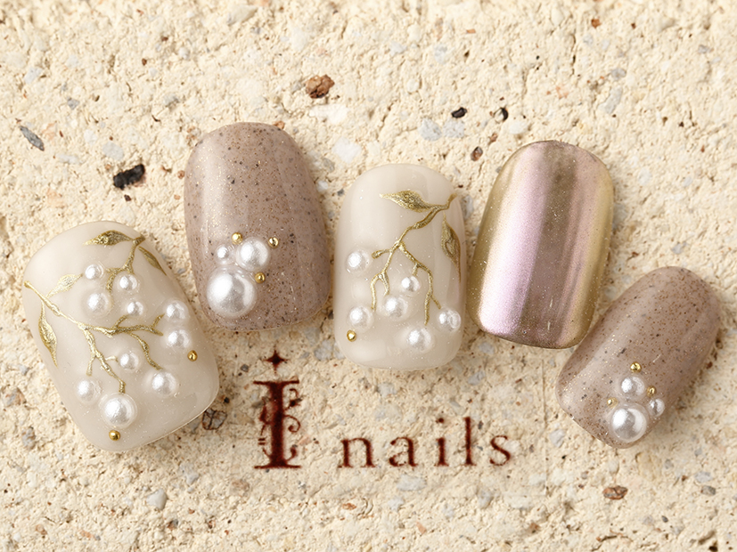 パールリーフアート COLOR ホワイト ブラウン ゴールド ベージュ ARTTYPE ワンカラー ラインストーン スタッツ パール 花柄 TASTE シンプル スウィート エレガント ブライダル エスニック SCENE パーティー お正月 成人式 秋ネイル 冬ネイル PRICE ¥9001~¥11000 ¥9480