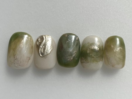グリーンゴールドニュアンス担当【NAKASHIBA】 COLOR ホワイト グリーン ゴールド ベージュ ARTTYPE マーブル ニュアンス ミラー 水彩 TASTE エレガント 上品 おしゃれ SCENE パーティー オフィス キャンパス オールシーズン デイリー PRICE ¥7001~¥9000 【Season】新規¥8500 再来¥9000[池袋/パラジェル]