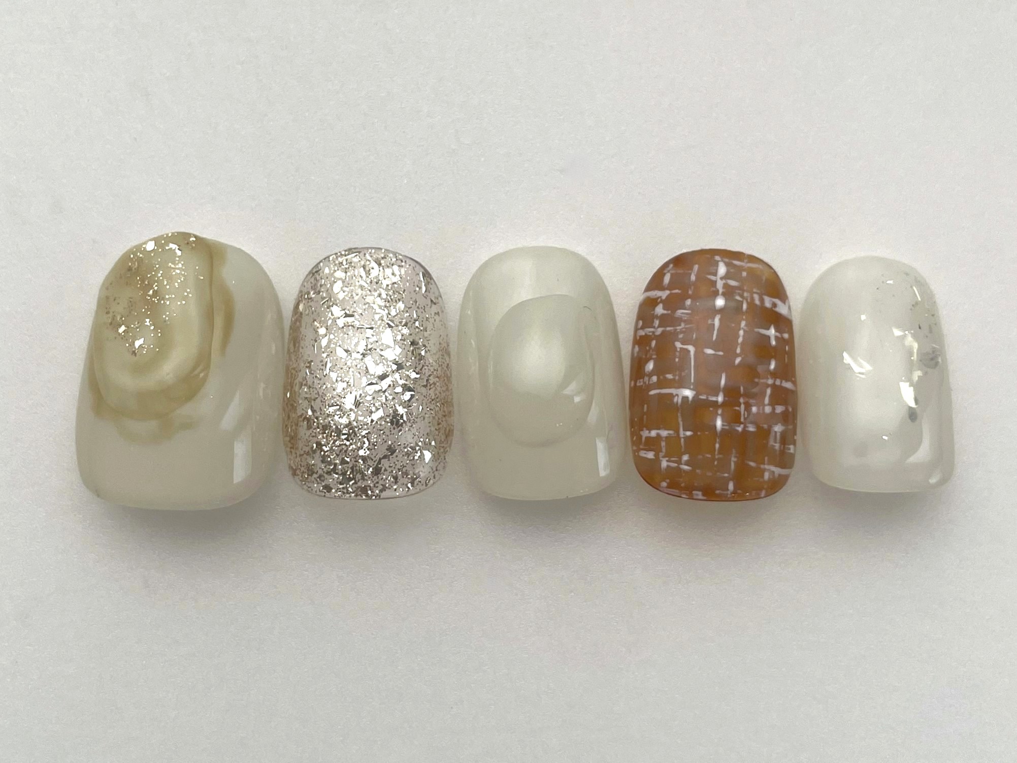ベージュツイード Amane COLOR イエロー ブラウン シルバー ベージュ ARTTYPE ワンカラー ラメ ぷくぷく TASTE エレガント 大人可愛い 上品 おしゃれ SCENE 誕生日 オフィス デート 秋ネイル 冬ネイル デイリー PRICE ¥7001~¥9000 【OfficeCasual】¥8000[池袋パラジェル]