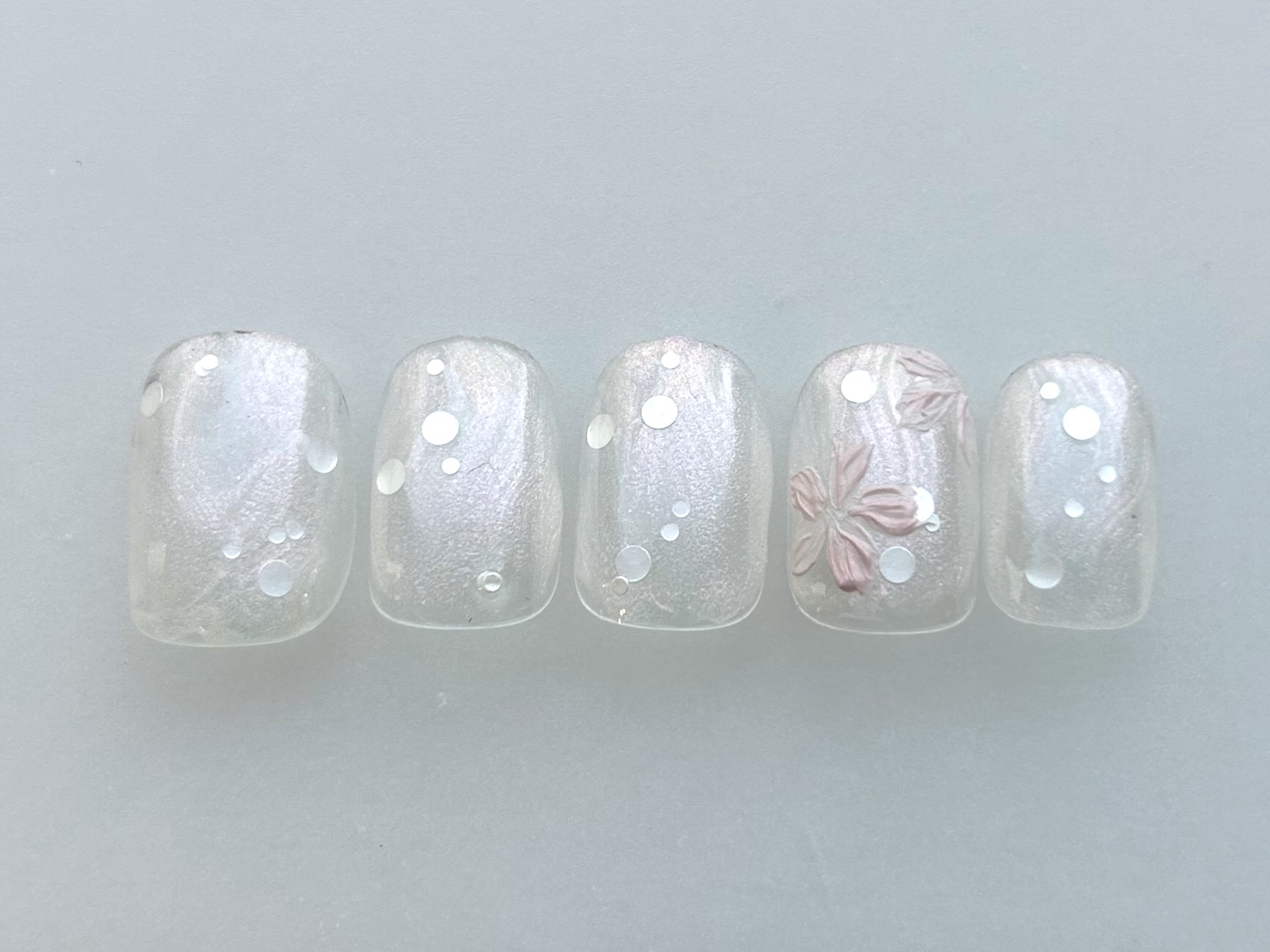 ピンクラメホロフラワー Ruri COLOR ホワイト ピンク ARTTYPE ホログラム ニュアンス TASTE シンプル 上品 SCENE デート 春ネイル デイリー PRICE ¥7001~¥9000 【Natural】¥7500[池袋/パラジェル]