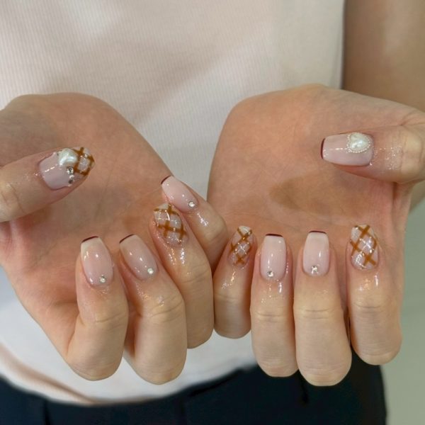 持ち込み90 ¥10550【担当野尻】 COLOR ブラウン ベージュ ARTTYPE ワンカラー ストーン チェック パーツ TASTE ガーリー 大人可愛い SCENE 誕生日 パーティー デート 秋ネイル デイリー
