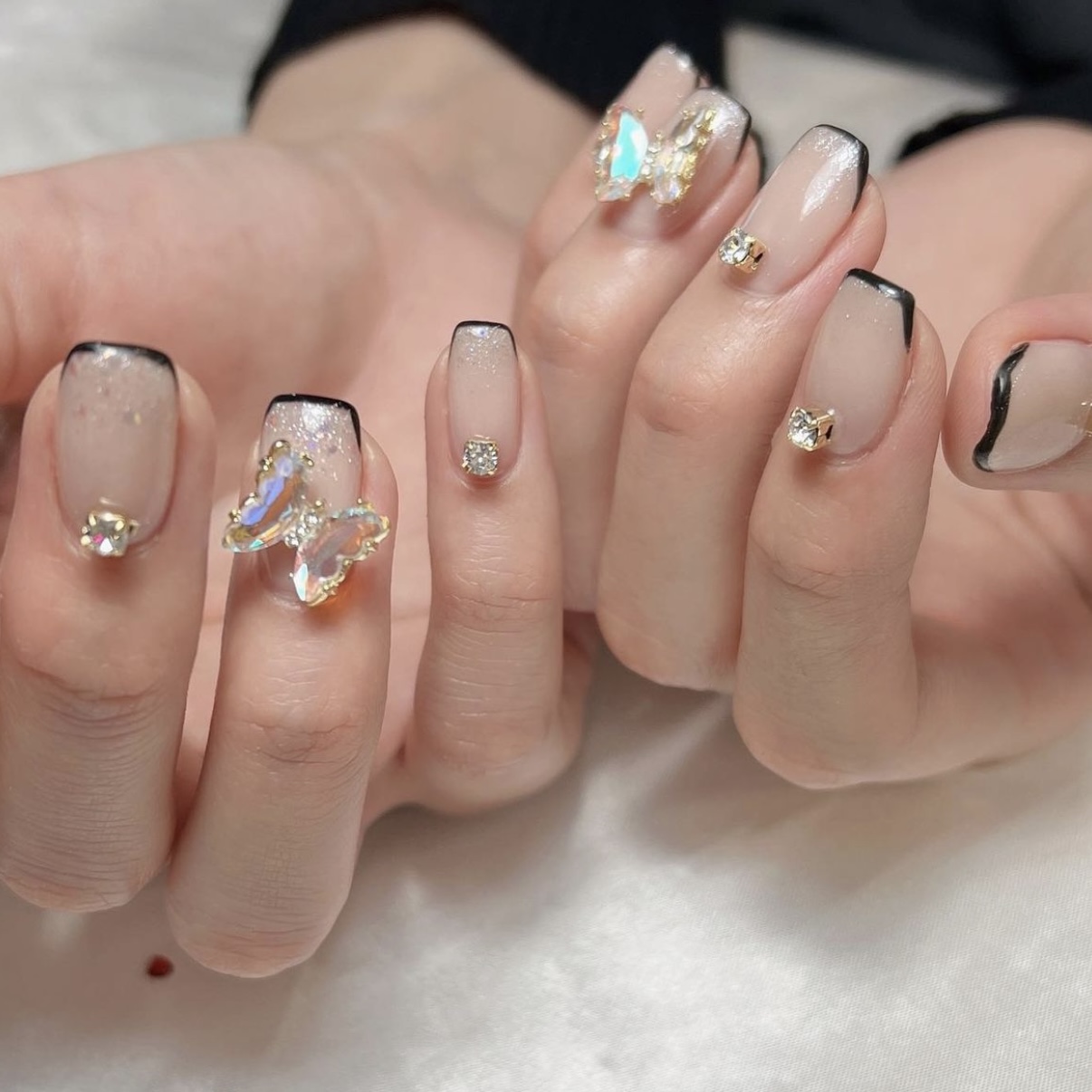 オーロラフレンチ蝶々【担当】飯塚 COLOR ホワイト ブラック ピンク ゴールド ベージュ クリアー オーロラ シアー ARTTYPE ワンカラー フレンチ 3D ラメ パール ホログラム ビジュー 凸凹 TASTE エレガント ゴージャス ポップ デコレーション ラブリー ガーリー おしゃれ SCENE 誕生日 パーティー デート 成人式 バレンタイン オールシーズン デイリー PRICE ¥9001~¥11000