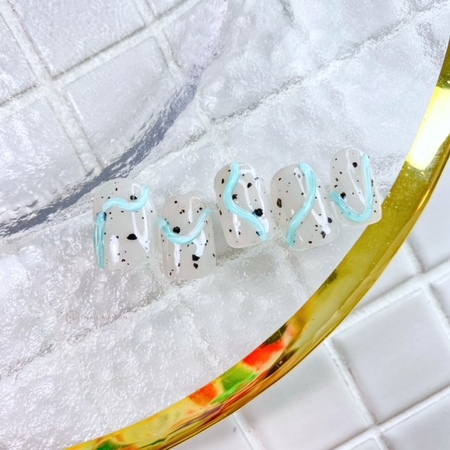 ダルメシアンニュアンスネイル 【担当】山崎 COLOR ホワイト ブルー ARTTYPE アニマル ぷくぷく TASTE スウィート おしゃれ SCENE キャンパス デイリー ダルメシアンワンカラーにうねうねぷっくり ¥4000