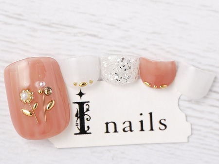 コーラルオレンジのフットネイル 【担当】佐藤 COLOR ホワイト シルバー オレンジ フット ARTTYPE ラメ スタッツ パール 花柄 TASTE スウィート ガーリー SCENE 春ネイル パーツで作るフラワーフットネイル ¥8980
