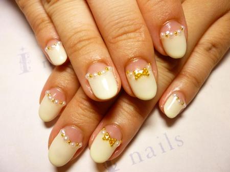 逆フレンチラインストーン COLOR ホワイト ARTTYPE 逆フレンチ ラインストーン TASTE シンプル スウィート ラブリー SCENE パーティー デート PRICE ¥5000~¥7000 パールやリボンで可愛らしく♪