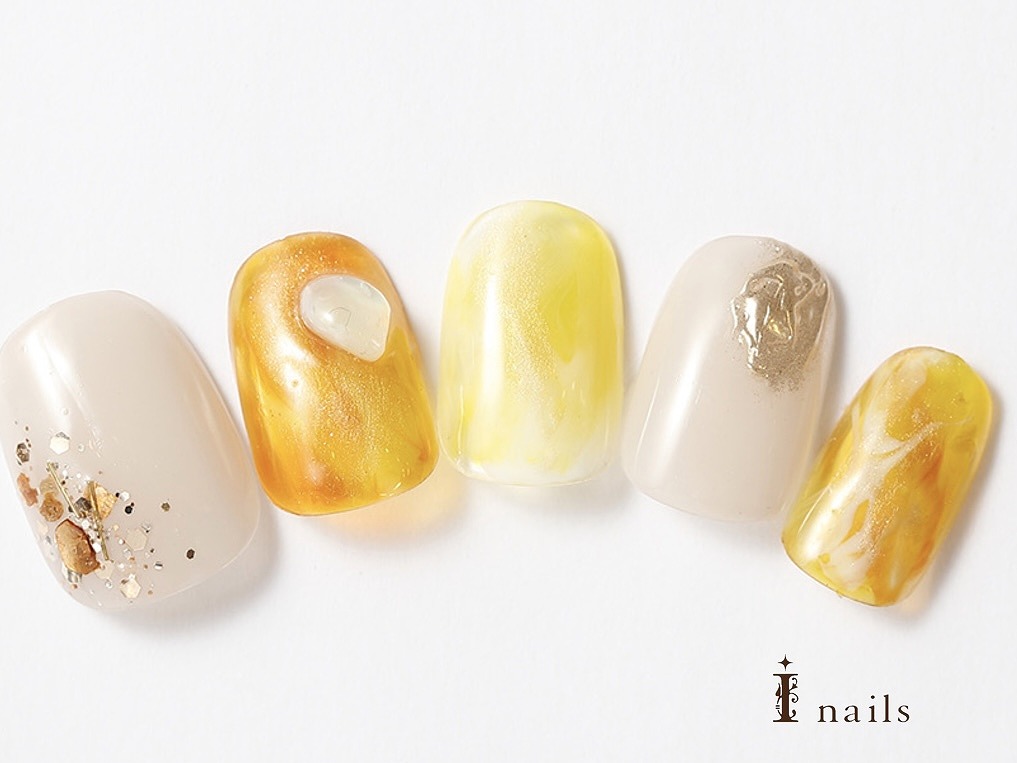 イエローニュアンスネイル 【担当】中本 COLOR イエロー ベージュ ARTTYPE ニュアンス ミラー 凸凹 TASTE シンプル SCENE 夏ネイル イエロー、オレンジのもやもやニュアンス ¥8480