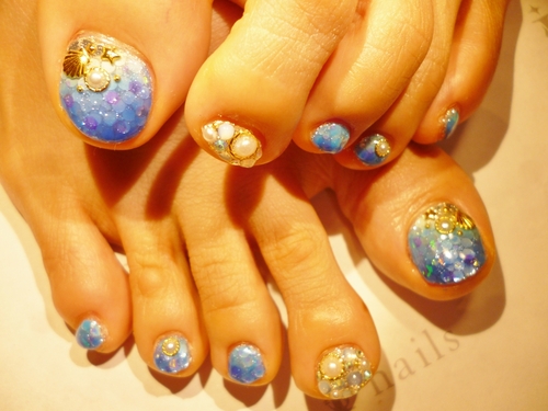 キラキラマリンフット 2014/07/14 シルバーのホログラムの上にクリアカラーをのせてキラキラな海を再現♪ Nail Pickup|~・~・~・~・~・~・~・~・~・~・~・~・ 所要時間:2時間 【オフあり】 Nailist:黒田