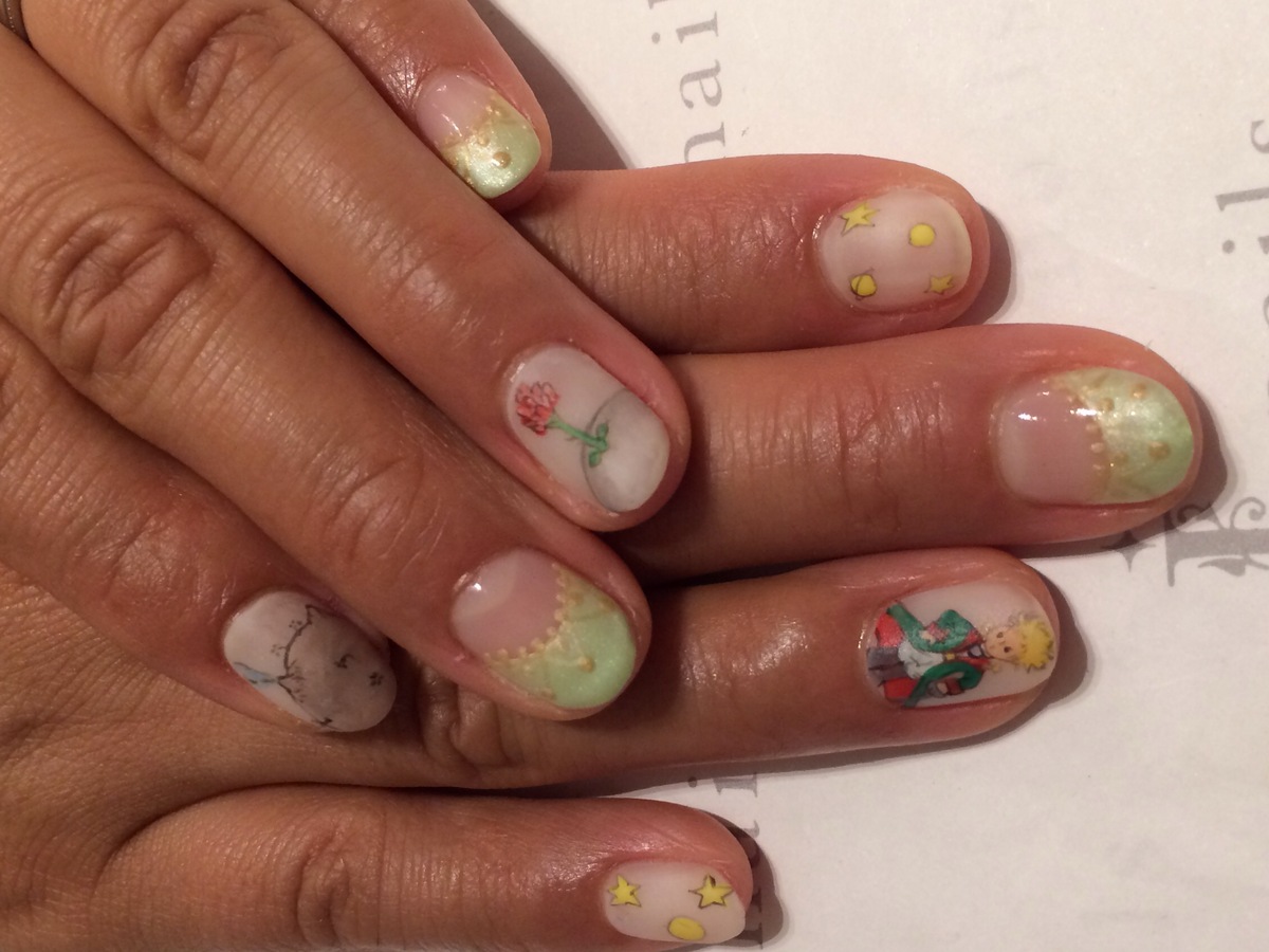 Le Petit Princeネイル 2014/11/14 物語ネイルも大人気!! 手書きで独特の優しい風合いになります。 Pickup|~・~・~・~・~・~・~・~・~・~・~・~・ 所要時間:2時間 【オフあり】 値段:ワンカラー 5140円 マットコート 500円 星の王子様 1620円 惑星 1296円 星空 1080円 Nailist:平宅