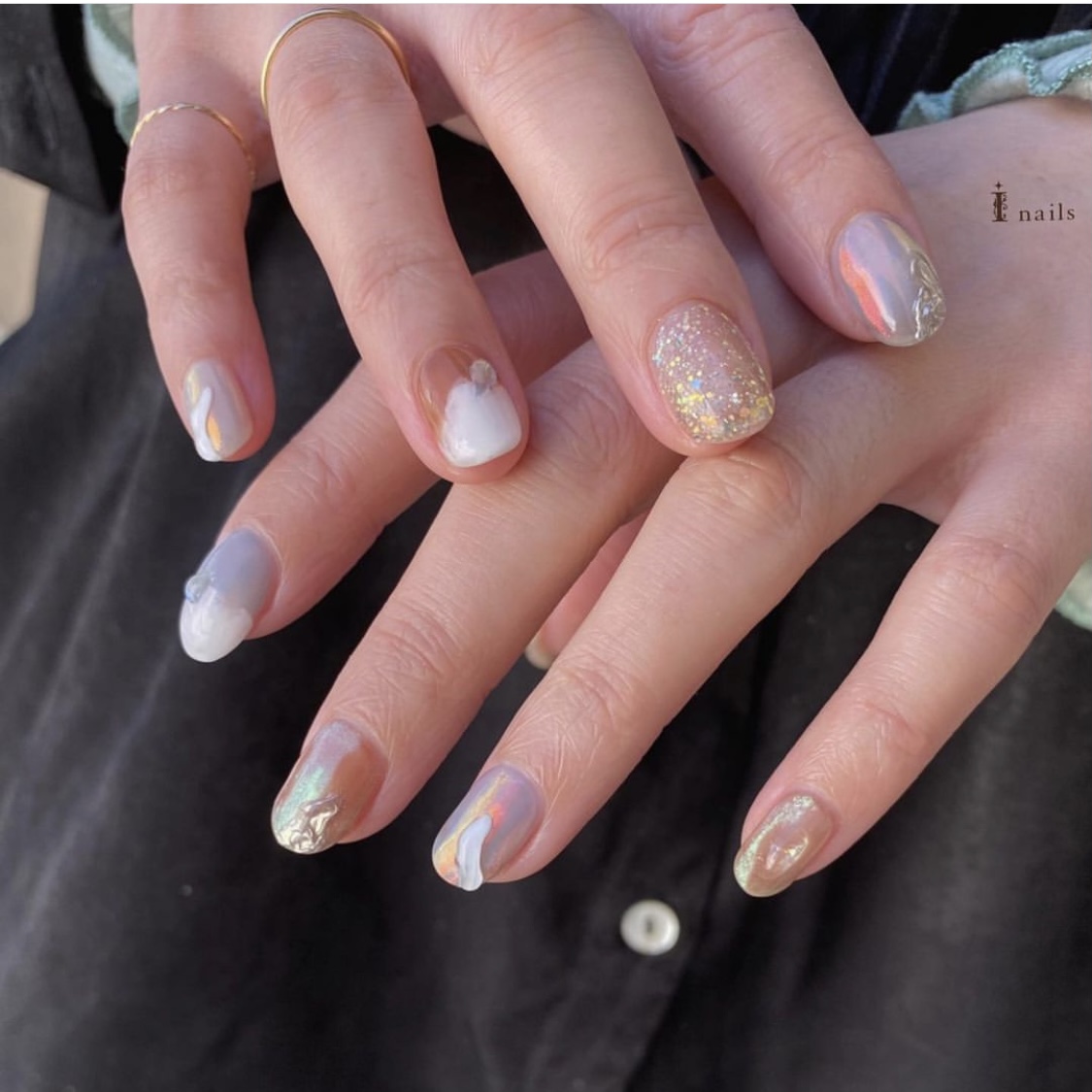 トレンドcollection ニュアンスオーロラネイル 【担当】maya.h COLOR ブルー ブラウン クリアー ARTTYPE 3D ラメ TASTE スウィート SCENE キャンパス オーロラ、ラメ、ミラー ¥7,800