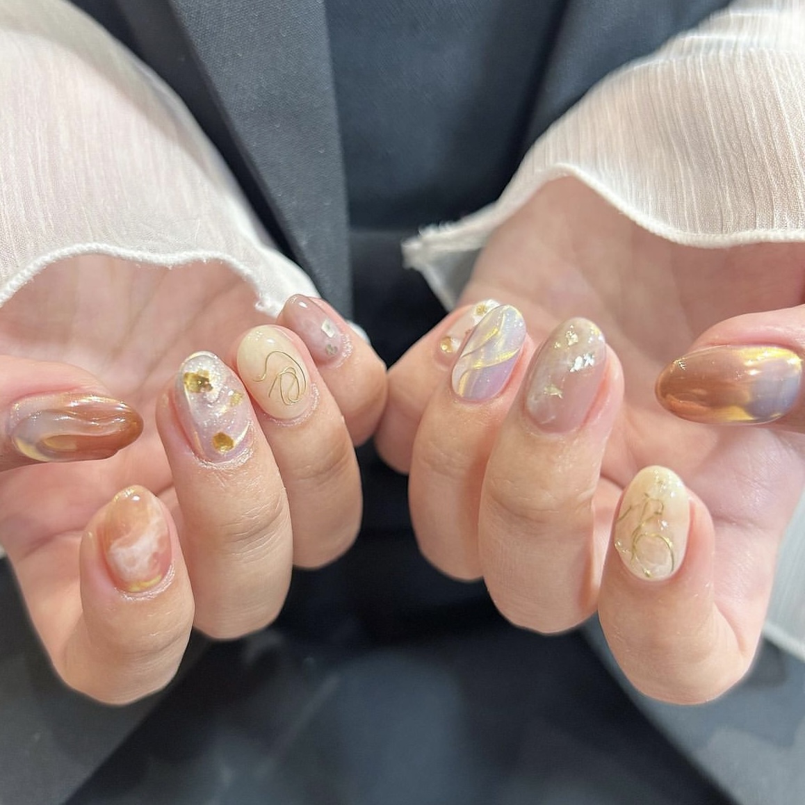 nuance collection ガーリーな詰め込みニュアンス 【担当】yuika.t COLOR ホワイト ピンク イエロー ブラウン ゴールド オレンジ クリアー カラフル オーロラ シアー くすみ系 ARTTYPE グラデ ラメ ニュアンス ミラー シェル ちぐはぐ パーツ 箔 ぷくぷく TASTE スウィート キャンディー ラブリー ガーリー 大人可愛い おしゃれ SCENE 誕生日 パーティー デート 秋ネイル 冬ネイル PRICE ¥7001~¥9000 秋色で詰め込みぷくぷくネイル ブラウン、アイボリー、ミラー、オーロラ、夕焼けグラデーション、ゴールド、ワイヤー、金箔、オレンジ、イエロー、ホワイト、ぷっくり¥7,800