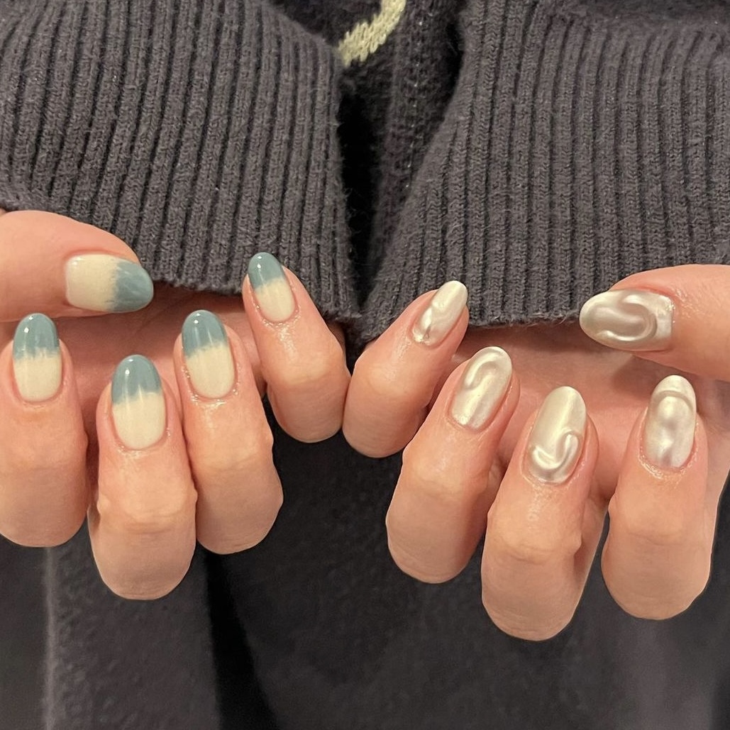 trend collection 個性派ちぐはぐネイル 【担当】yuki.y COLOR ブルー シルバー ベージュ くすみ系 ARTTYPE ワンカラー フレンチ 逆フレンチ ダブルフレンチ 変形フレンチ グラデ マーブル ミラー ちぐはぐ マット ぷくぷく TASTE シンプル クール ゴージャス デコレーション レトロ 個性派 大人可愛い おしゃれ SCENE 誕生日 パーティー キャンパス デート お正月 海 オールシーズン デイリー PRICE ¥7001~¥9000 くすみブルーとベージュのツートンに、マットシルバーをぷっくりさせたちぐはぐネイル ¥8,300