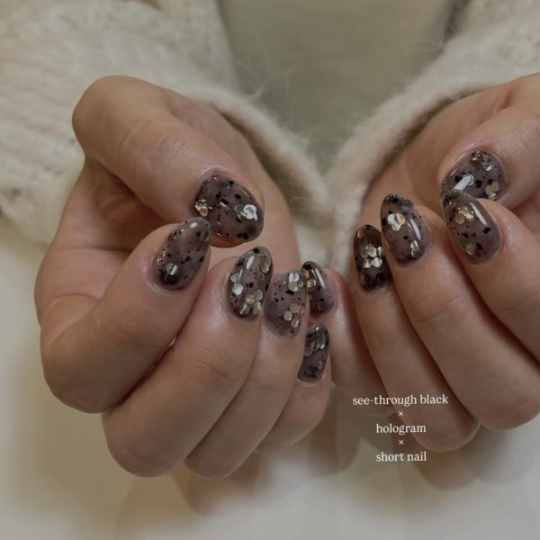 シースルーブラックにキラキラホロフラムで奥行きネイル
