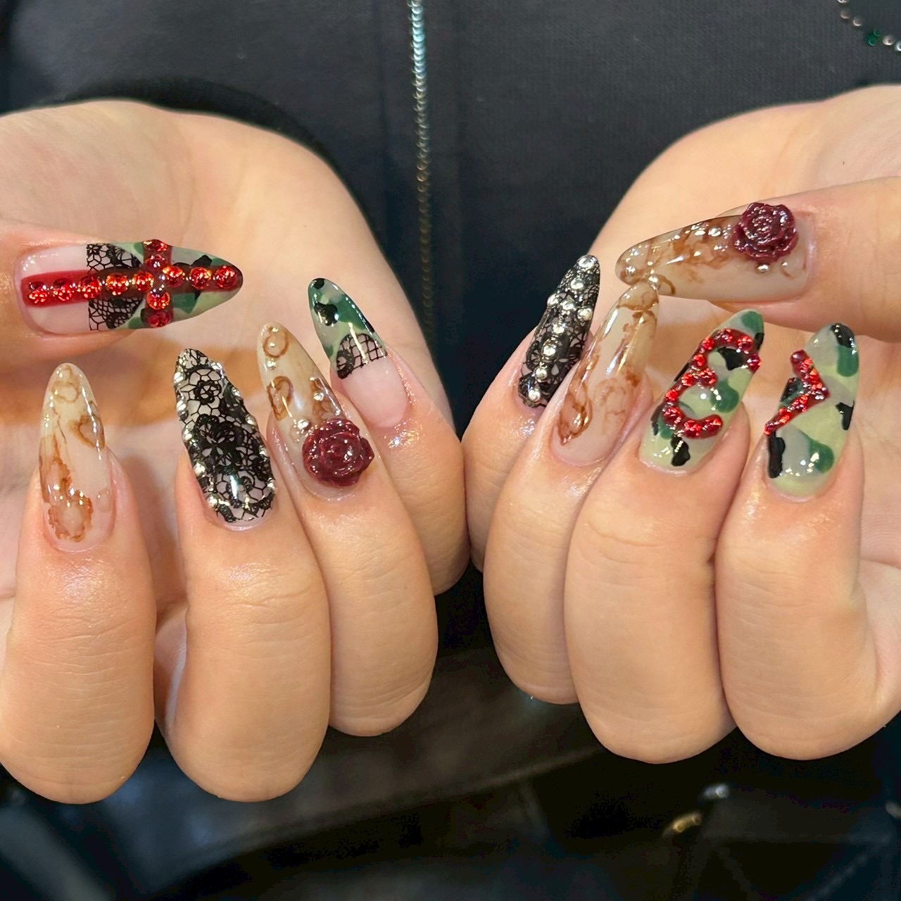 - ワンカラー フレンチ 変形フレンチ マーブル ストーン ラインストーン スタッツ ペイント レース ニュアンス インクアート パーツ