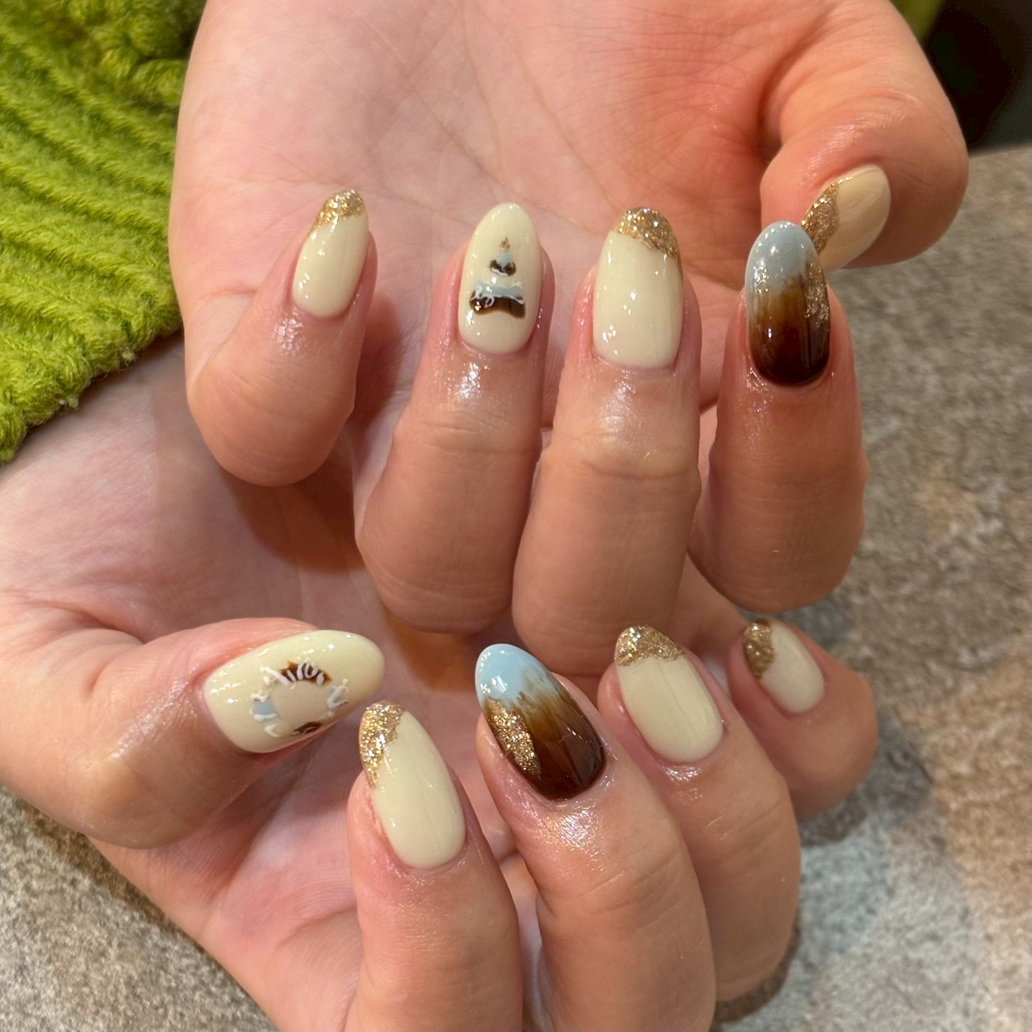 ゆるかわクリスマス【rina】 COLOR ホワイト ブルー ブラウン ゴールド カラフル グレージュ くすみ系 ARTTYPE ワンカラー マーブル ペイント ピーコック TASTE シンプル スウィート エレガント ポップ キャンディー ラブリー ガーリー レトロ 個性派 大人可愛い 上品 おしゃれ SCENE 誕生日 パーティー オフィス キャンパス デート クリスマス 冬ネイル デイリー PRICE ¥9001~¥11000 ゆるっとふんわり可愛いクリスマスネイル ¥10200