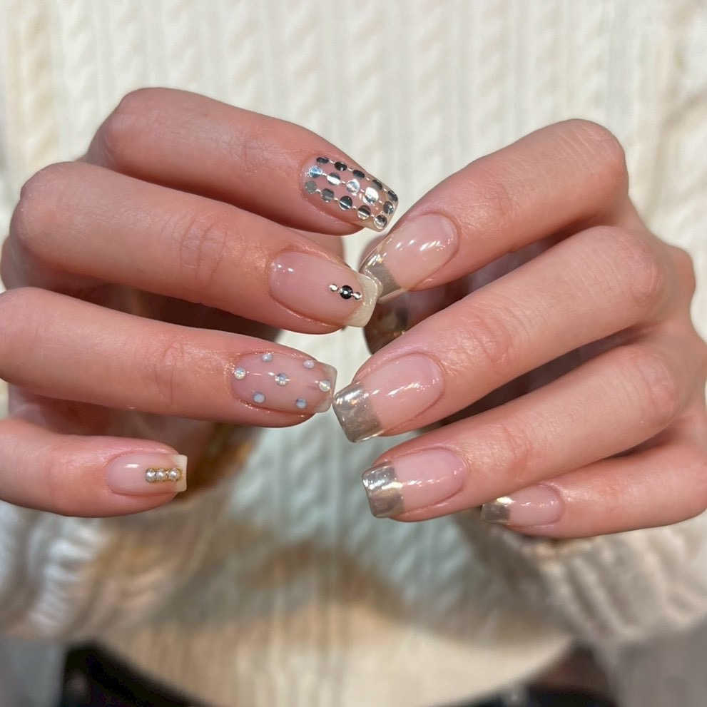 - ワンカラー フレンチ 変形フレンチ ストーン ラインストーン ドット ホログラム ミラー