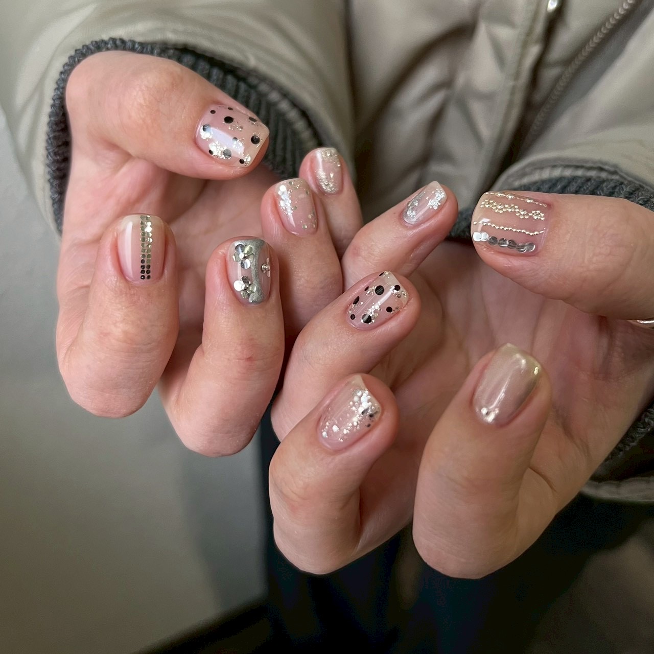 - ワンカラー ストーン ラインストーン ラメ スタッツ ドット ホログラム ニュアンス ミラー ホイル 箔 囲み