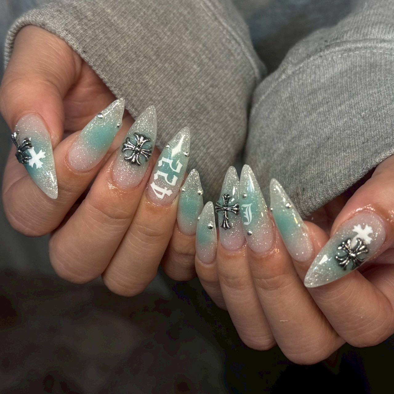 十字架Y2K 【mei】 COLOR ブルー シルバー クリアー ARTTYPE グラデ スタッツ パーツ TASTE シンプル クール ゴージャス ロック ラブリー モード 個性派 上品 SCENE パーティー デート 海 冬ネイル 夏ネイル PRICE ¥9001~¥11000 ターコイズブルー×チーク ¥9200