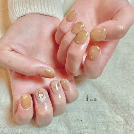 ベージュ×ゴールドネイル 【担当】泊 COLOR ゴールド ベージュ ARTTYPE フレンチ ストーン TASTE スウィート SCENE オフィス 春ネイル ベージュカラーでオフィスでもOK ¥8700