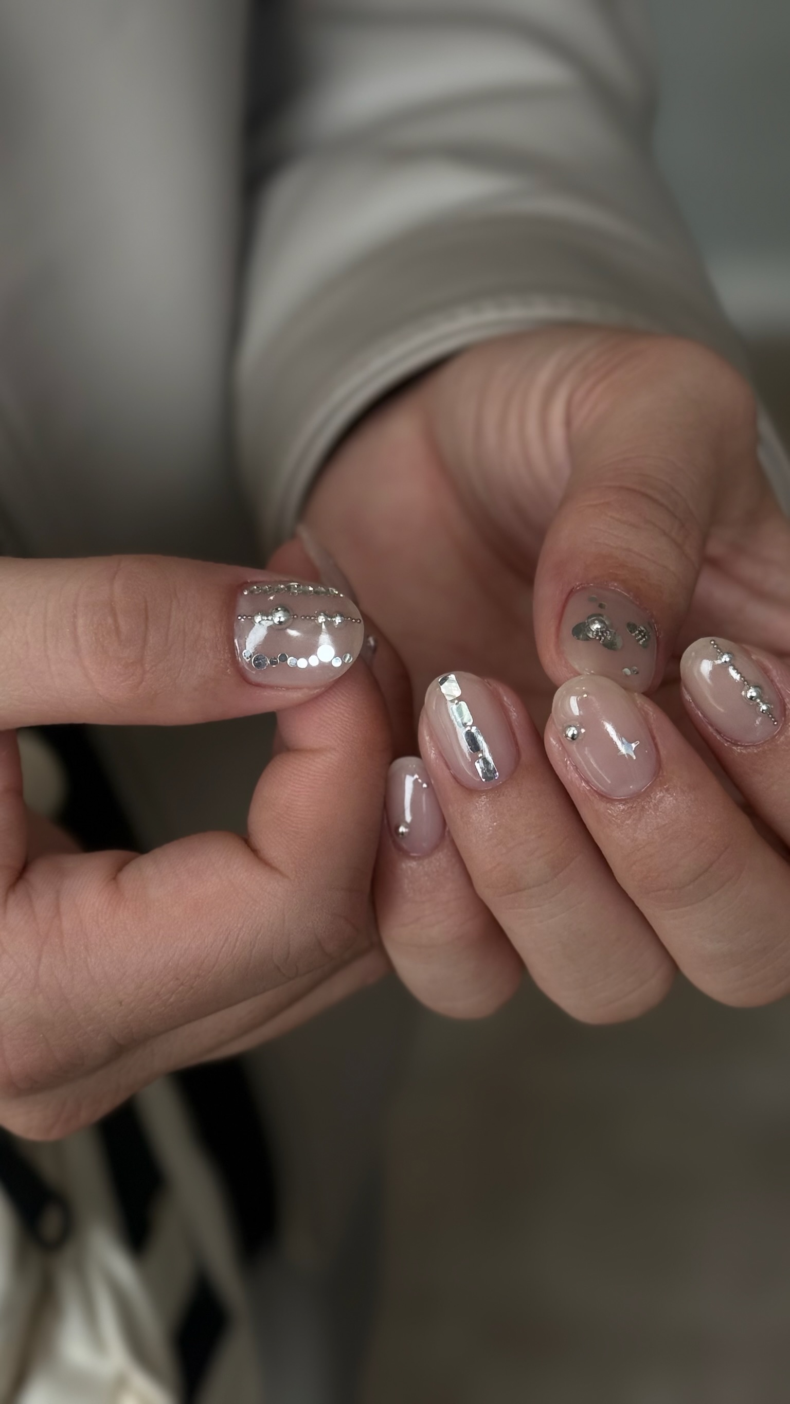 ビジューミラーホロネイル COLOR ベージュ ARTTYPE ワンカラー ちぐはぐ TASTE シンプル SCENE デート ホログラムとスタッズを組み合わせたデザインベースはスキンカラーで手元になじみます薬指で使っているものは新しい商材で鏡のように反射するホログラムが入荷しました。個人的に一押しのアイテムです